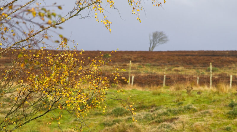 A tree with sparse yellow leaves stands in the foreground of a grassy, autumn landscape. In the distance, a lone bare tree is visible on a brown, slightly hilly horizon under a cloudy sky.