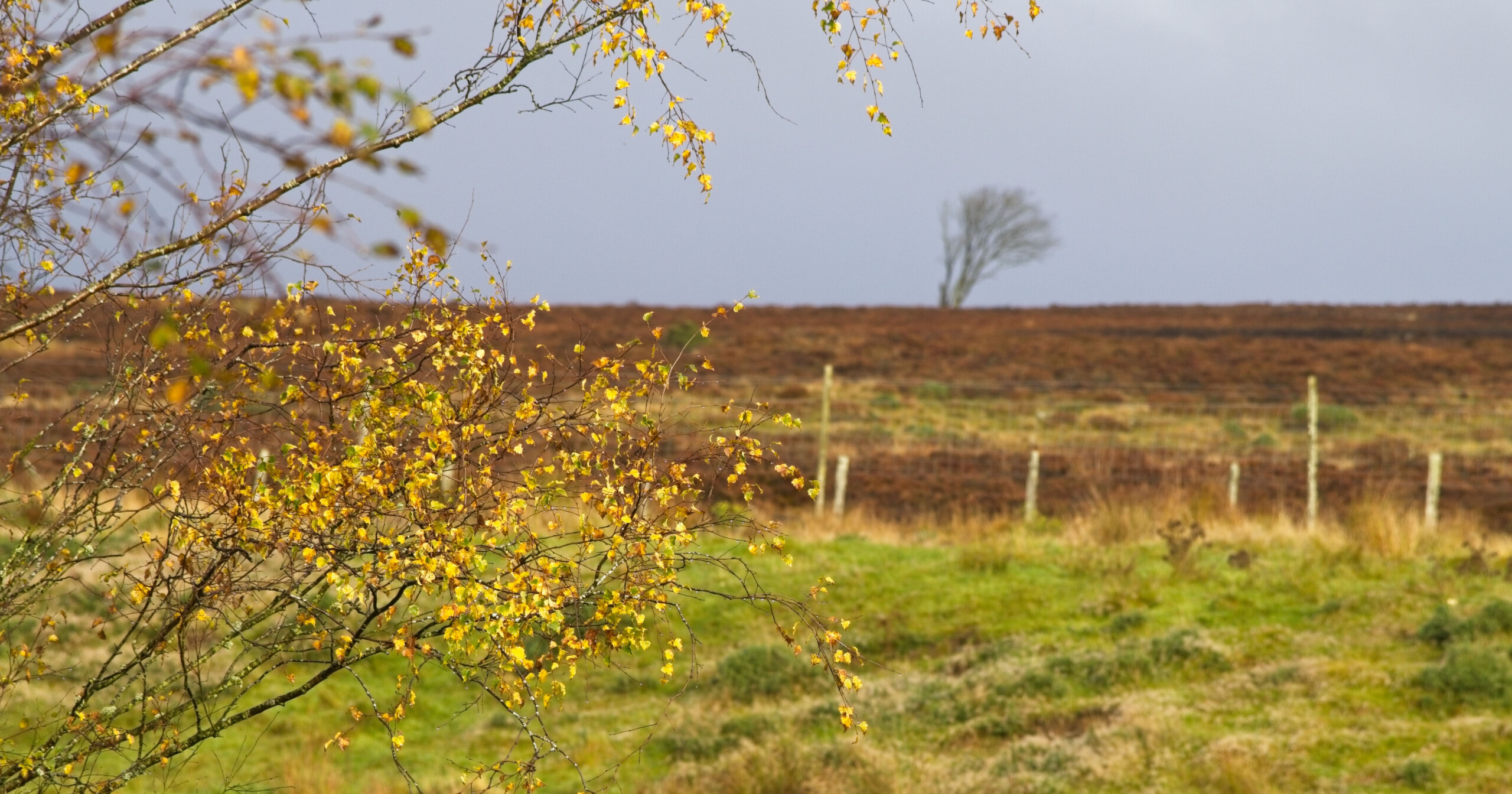 A tree with sparse yellow leaves stands in the foreground of a grassy, autumn landscape. In the distance, a lone bare tree is visible on a brown, slightly hilly horizon under a cloudy sky.