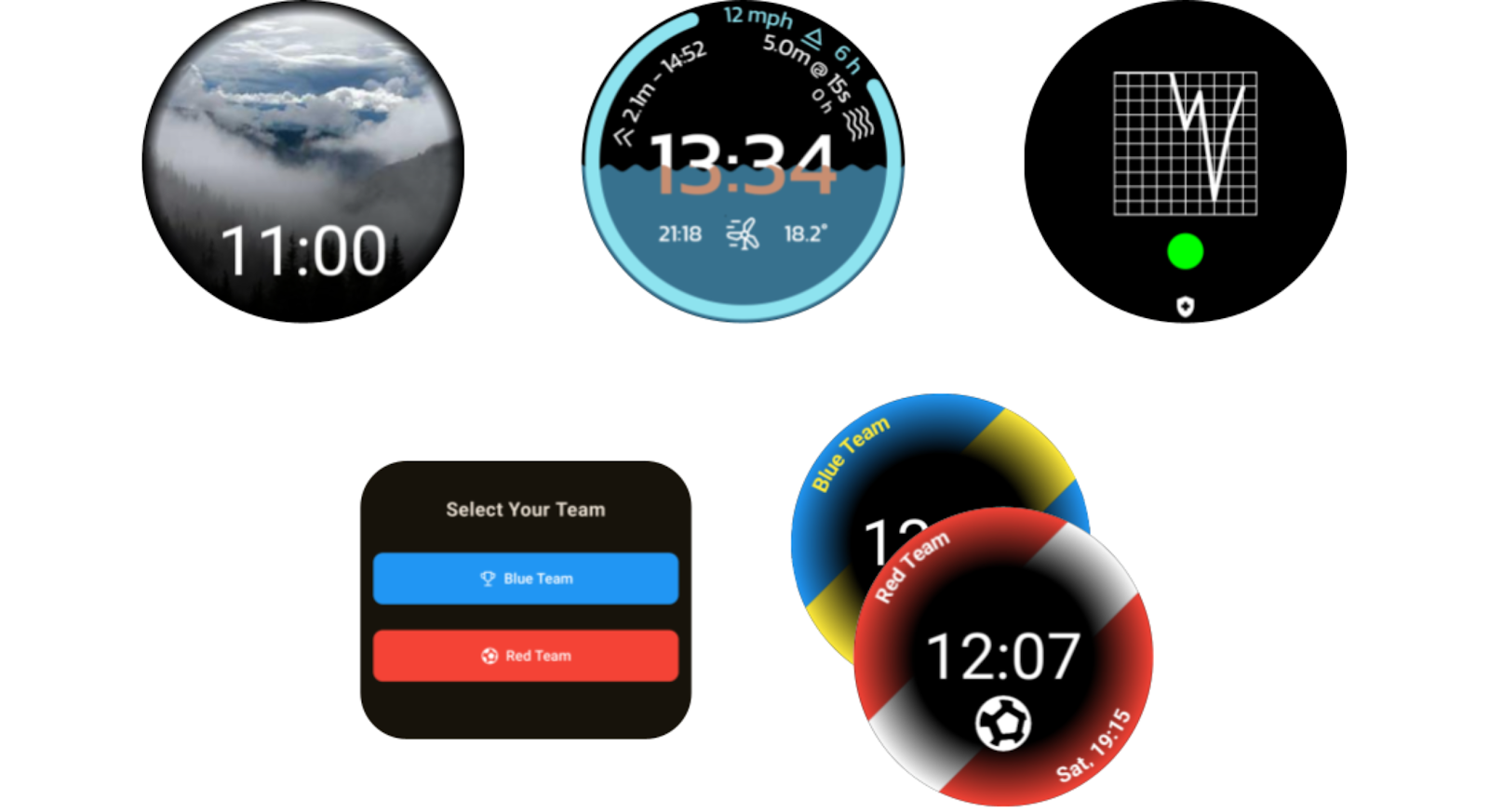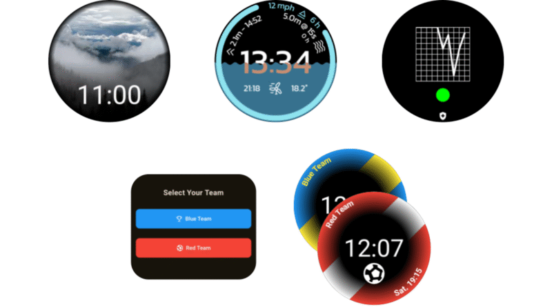 Additional samples made using WFP, starting top left: Photo Album, Surfing, Connected Device, and Football Team watch faces