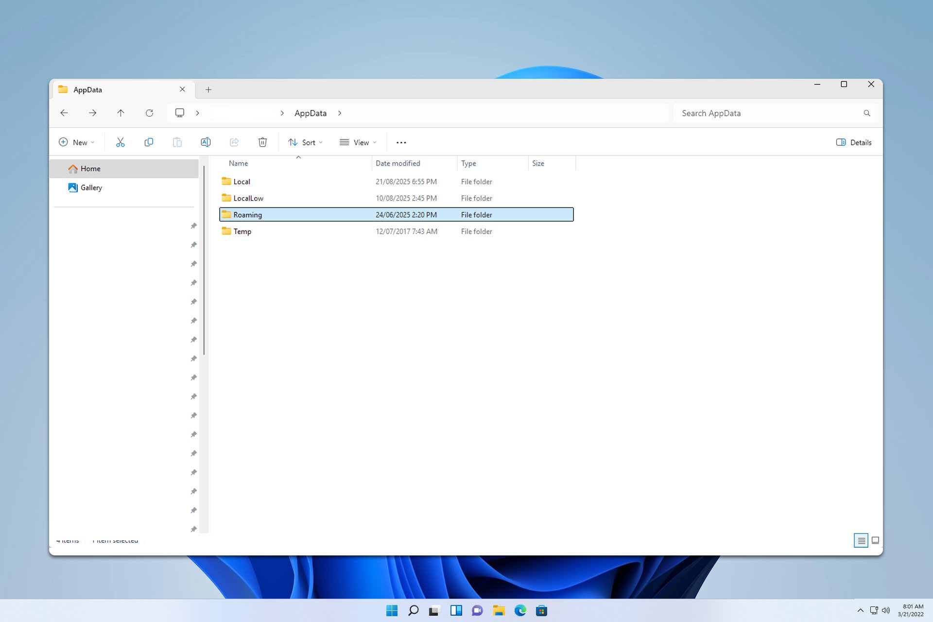- Roaming – Contains data that can move with your user profile between devices on a network, such as browser bookmarks or app preferences.